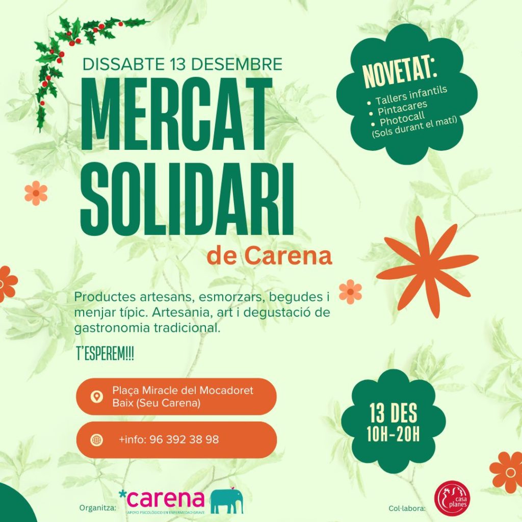 📢 Falta menys de 1 mes! El 13 de desembre torna el Mercat Solidari de Carena. Apunta la data i no faltes! Tindrem:– Menjar casolà– Artesania– Novetat: Tallers infantils per als més menuts Tot a benefici de Carena!! 📍 Vine, gaudeix i ajuda’ns a créixer👉 Reserva el dia i comparteix-ho!